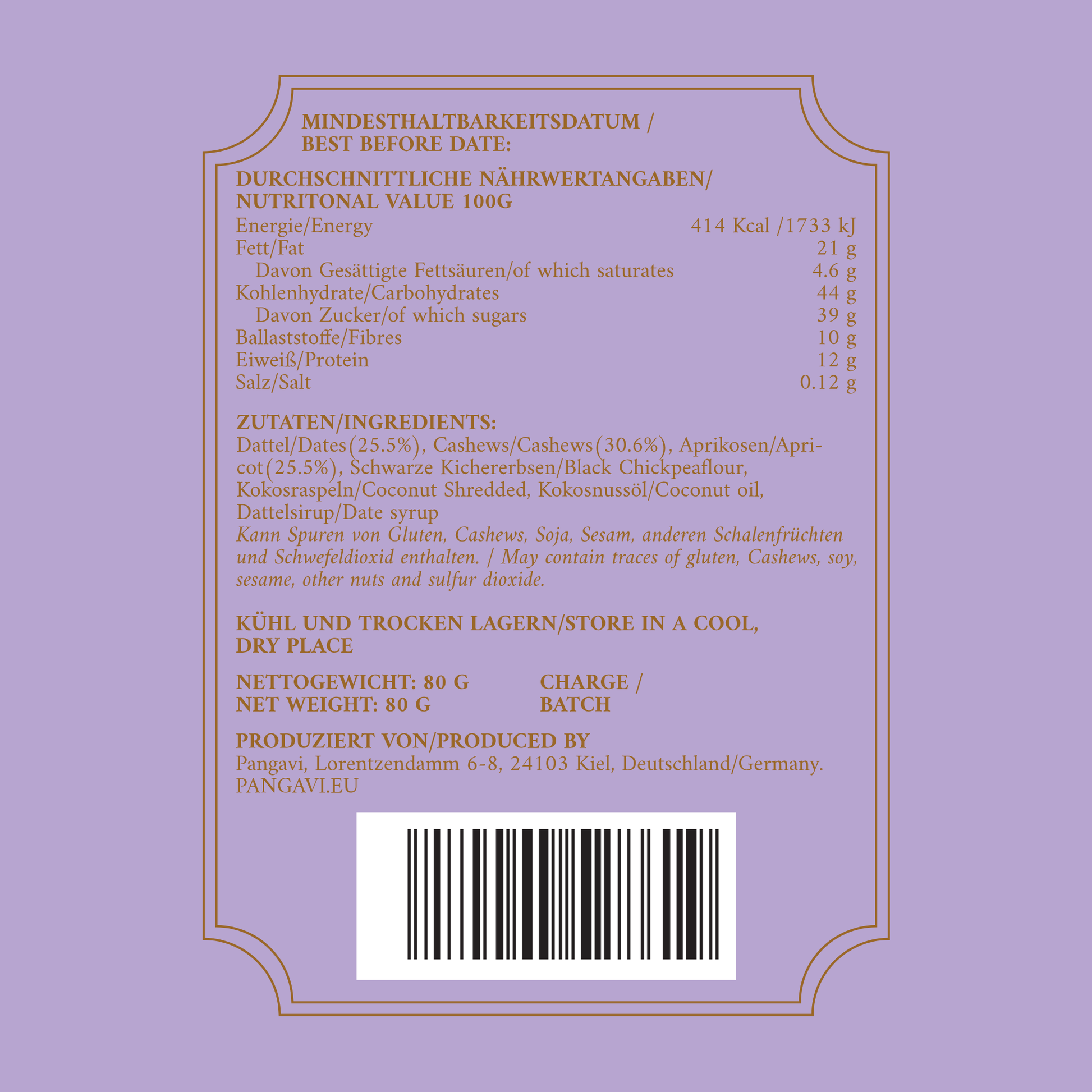Clean Ingredients: Datteln, Cashews, Aprikose, Kichererbsenmehl, Kokosnuss, Kokosöl – that’s it.